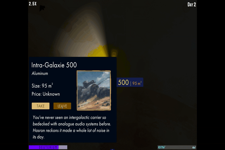 For this game, I integrated Yarn Spinner with Unity to create a deeply customizable dialogue system that was immensely satisfying to use. This Canyons world exploration is a resource management game driven by the story of two friends on a mission. With the galaxy-wide Maelstrom Cup only ten days away, it's up to the player to guide CH1-P and Hasron towards finding valuable scrap that generates as many memories and conversations as it does income.